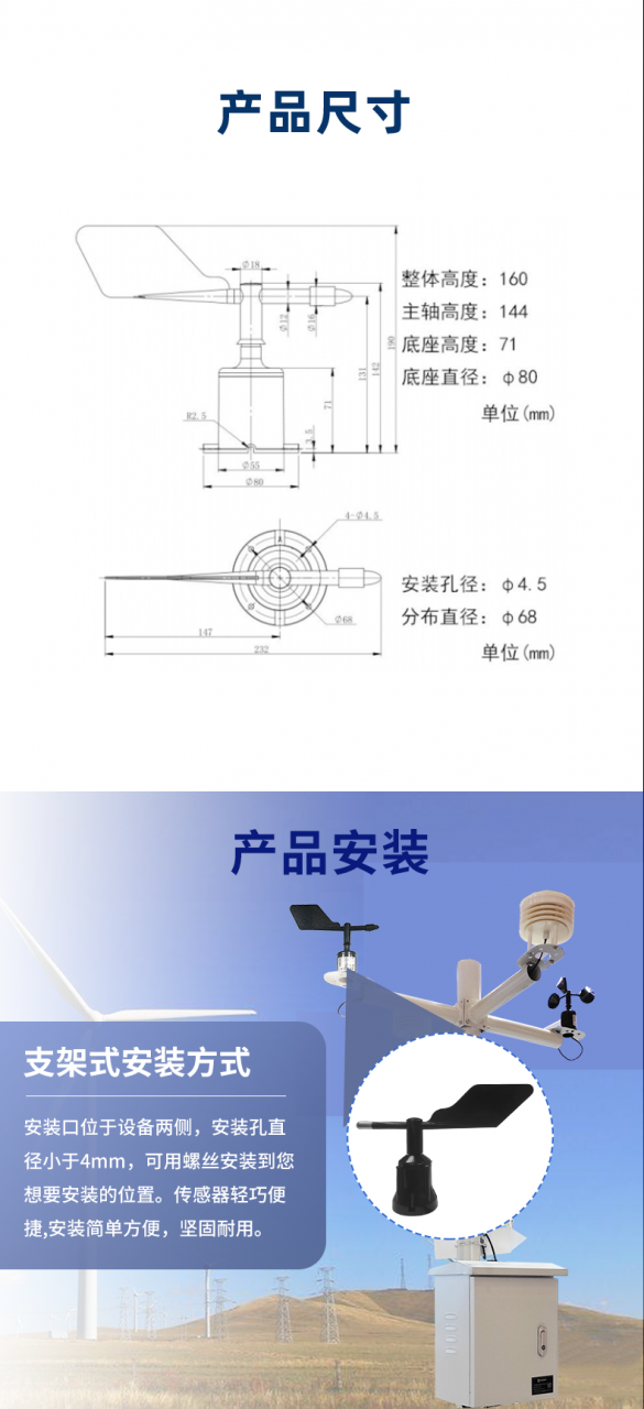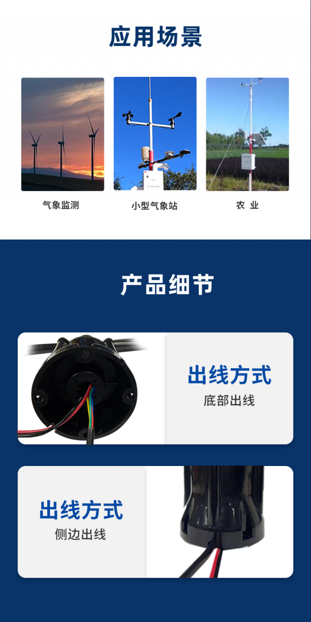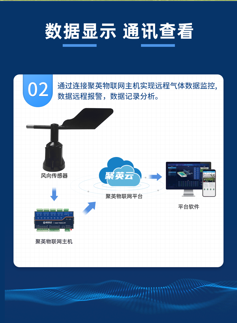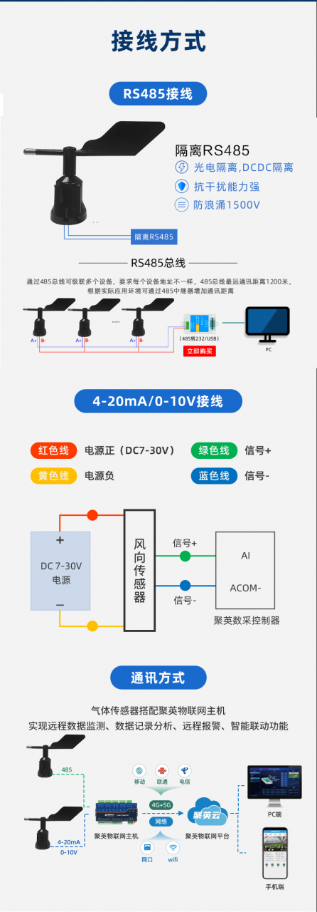 風速傳感器具備IP65防水、防潮防腐蝕、高靈敏度、穩定可靠等特點,通過連接聚英物聯網主機實現遠程氣體數據監控,數據遠程報警,數據記錄分析,采用進口軸承,阻力更小,數據更精確適用于氣象、海洋、農田等場合風速監測,可在氣象監測,小型氣象站,農業等場景下使用
