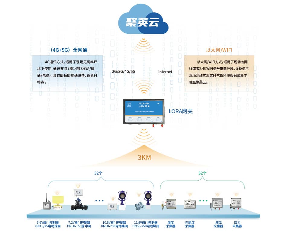 聚英大田農業灌溉系統基于LORA無線擴頻和4G/網絡通訊技術,使用LORA網關+LORA無線控制終端+LORA無線采集終端硬件設備,結合聚英農業物聯 網平臺,實現遠程不限距離數據采集,遠程控制功能。